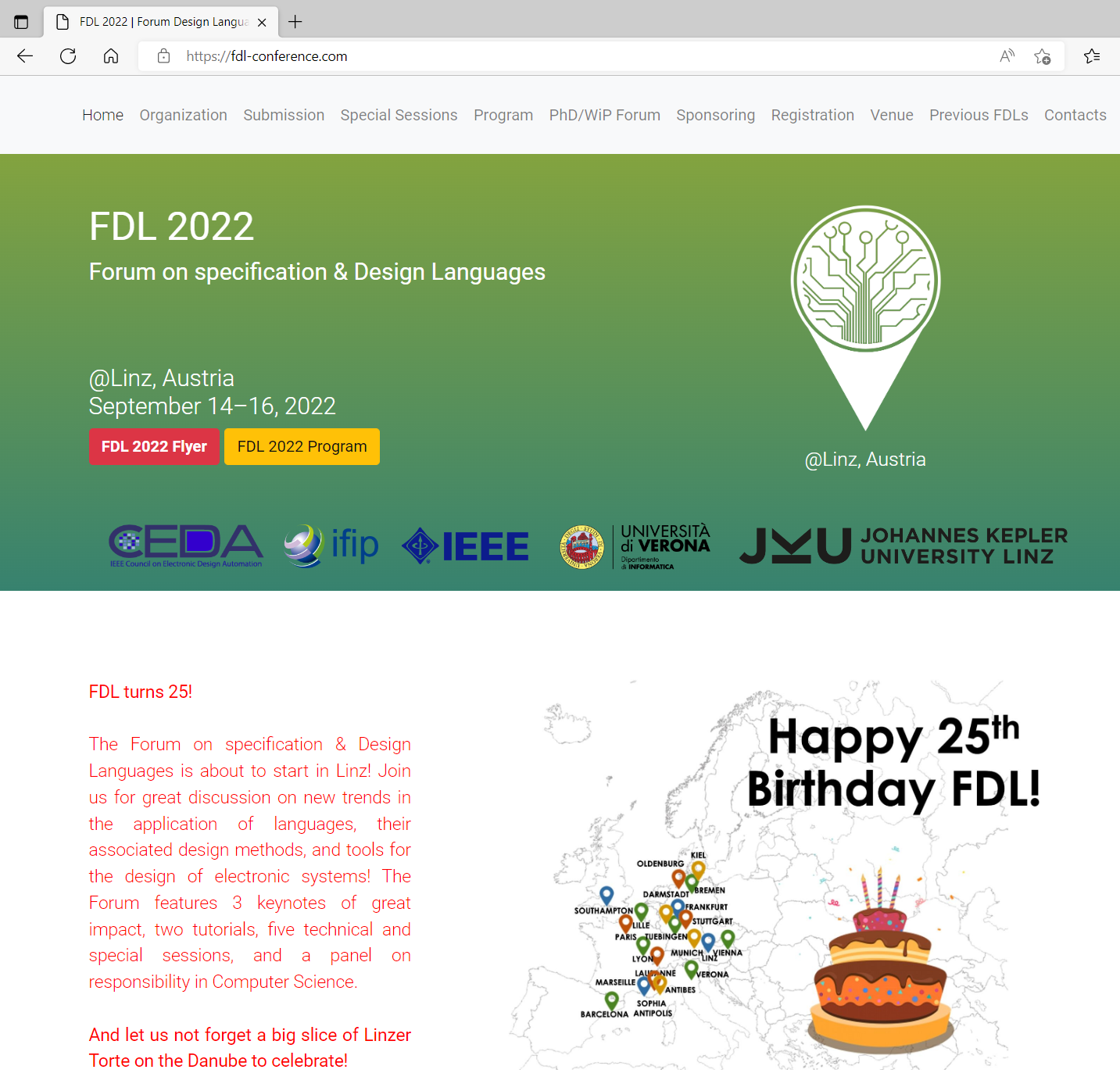 Sep 14-16, 2022: We are organizing the 25th IEEE Forum on specification & Design Languages (FDL) in Linz. Screenshot of the FDL 2022 website when starting the conference.